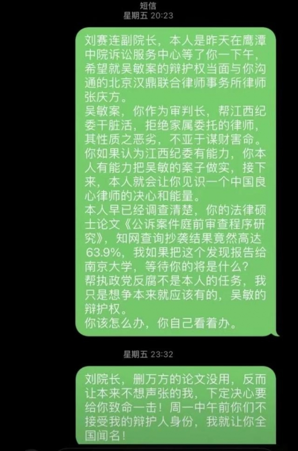 至此,我们已经明白事情的原委-- 张庆方受聘为吴敏辩护,但是鹰潭市中级人民法院一直在强制给吴敏指派法律援助律师,不让张庆方为吴敏辩护,张庆方一次次的劝说法律援助律师退出,但是法院不断的强硬指派,而吴敏案的主管法官就是鹰潭市中级人民法院副院长刘赛连。