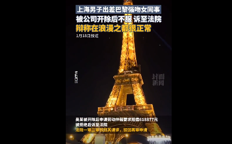 近日,媒体公布一起案件引发关注。上海某公司男员工吴某在法国巴黎培训时,强吻、搂抱一同出差的女同事,被公司认定属于重大过失,违反《员工手册》,与其解除劳动合同。