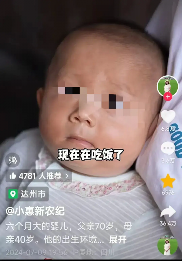 这位博主网名为"小惠新农纪"!她在7月9日发布了一则,有关四川达州渠县一名6个月大的婴儿,和他70岁父亲以及39岁患有癫痫的母亲的视频!