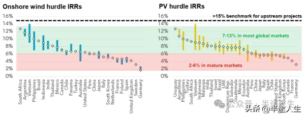 据彭博社统计,油气上游项目决策回报率门槛值为15%,成熟市场风电、光伏回报率为2%~6%,其它市场为7%~13%。中国的风电、光伏已进入成熟市场。