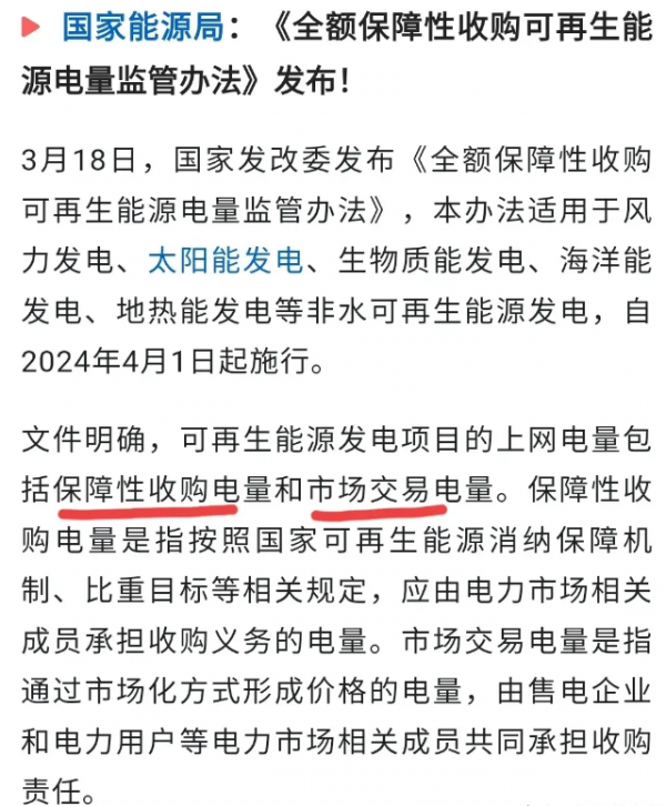 根据国家发展和改革委员会发布的《全额保障性收购可再生能源电量监管办法》,从2024年4月1日起,电网公司将不再承担新能源电力的全额收购义务,而是转向保障性收购,这意味着部分新能源发电量将进入市场化交易。