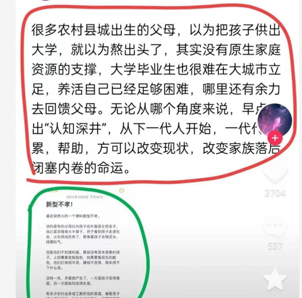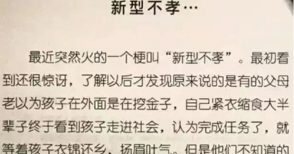 然而随着时代的发展,当年轻人想要在大城市里追求更好的生活,那么他们的思想观念就会与父母发生碰撞,进而也衍生出了"新型不孝"的概念。