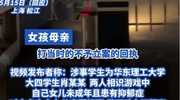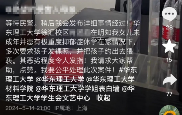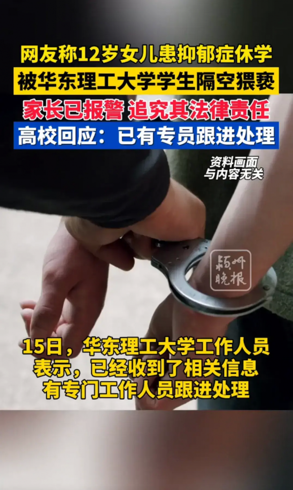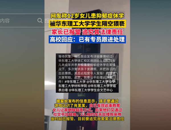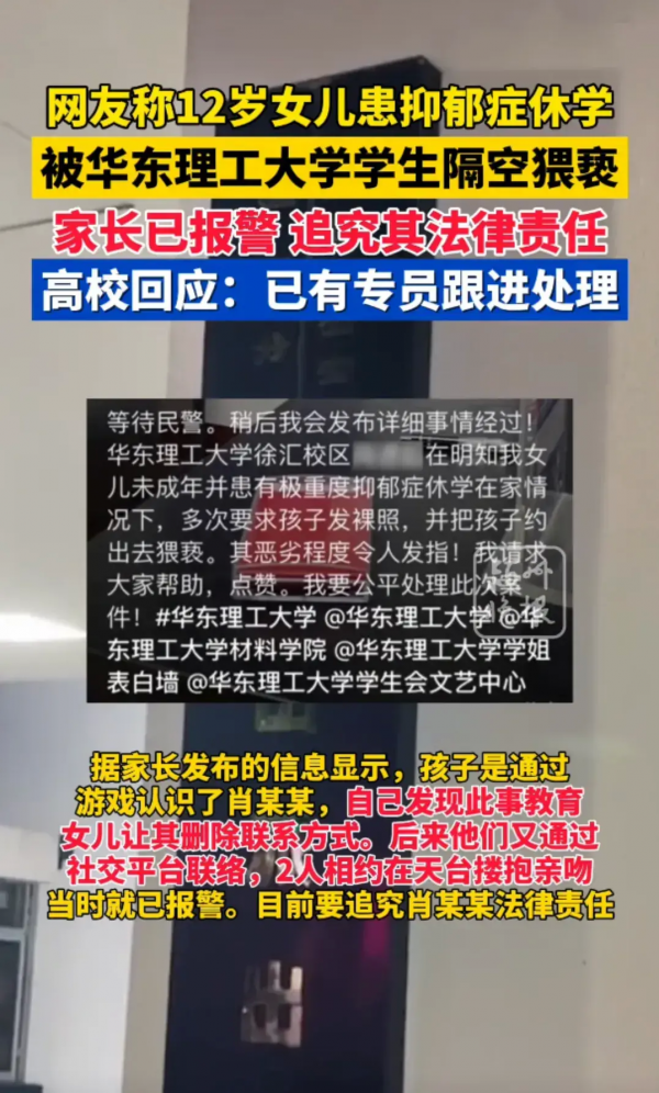 5月14日,一个引起广泛关注的事件在社交媒体上被曝光。一名网友爆料称,华东理工大学的一名大四学生肖某,向其12岁患有抑郁症的女儿索要裸照,并企图约她出门。这位家长透露,他的女儿因患抑郁症已暂停学业在家,她与肖某是通过在线游戏相识的。尽管知道女孩未成年且身心状态不佳,肖某仍多次提出不当要求。