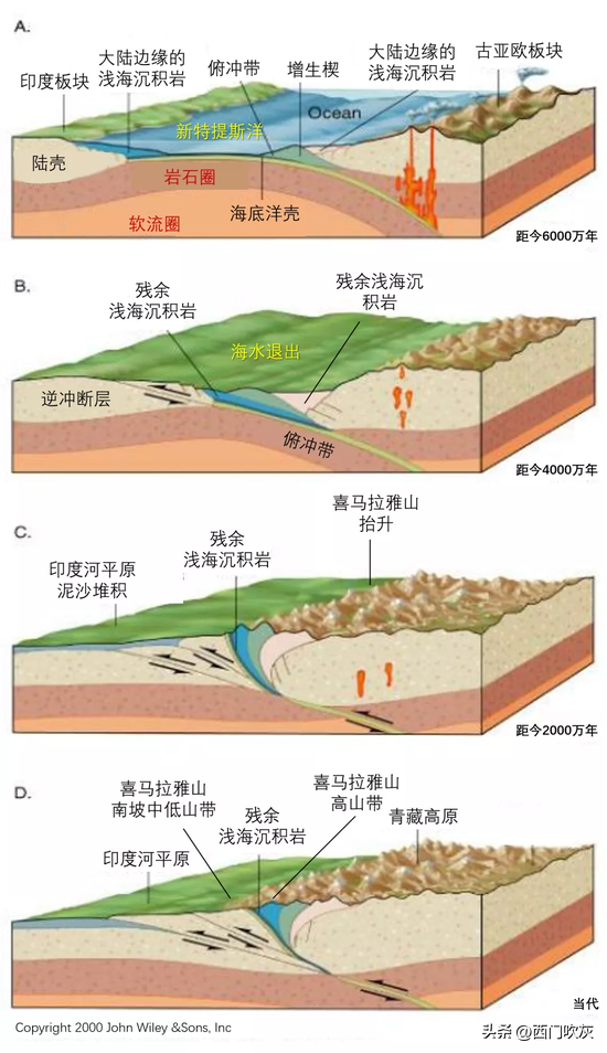 整个印度板块往东北方向俯冲恰好遇到向西南方向移动的亚欧板块,导致亚欧板块整体被抬升,最终形成了喜马拉雅山脉。