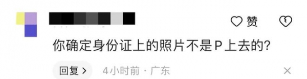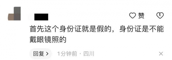 有评论质疑其身份证的真实性,指出身份证上不应该带眼镜照相。