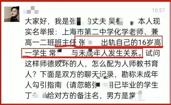 2月18日,上海男子实名举报教师妻子出轨16岁男的不当关系。