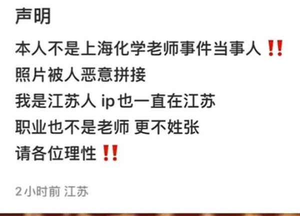 她声称自己并非网络上所指的上海女教师,自己的照片被人恶意使用,并且她一直生活在江苏,职业也不是老师。