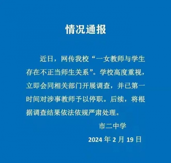 2月19日,女教师所在的中学做出通报:立即对张某进行了停职处理,并公开表示将根据调查的最终结果,依法依规严肃处理。