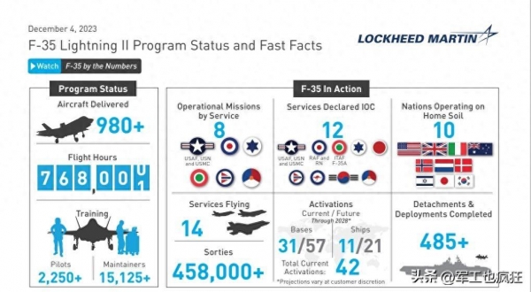 2023年12月4日,美国国防部F-35联合计划办公室(JPO)与洛克希德·马丁公司(NYSE:LMT)发布了最新简报:F-35"闪电II"全球机队规模已超过980架。计划年底交付量突破1000架的目标却没有实现,这是咋回事呢?