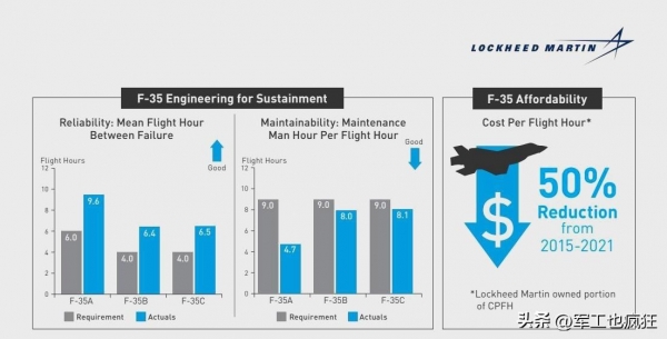 在单位飞行成本方面,目前的成本比2015年降低了50%;预计到2025年再降低40%:将每小时的飞行成本降低到2.5万美元,以确保美国和盟友能以经济实惠的方式运营F-35。