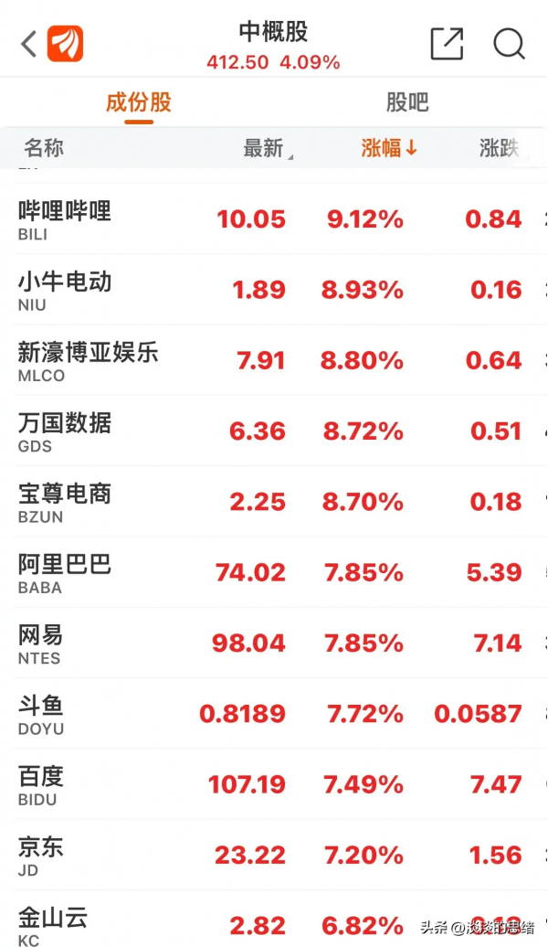 A股百度云大涨9.32%,B站大涨9.21%,阿里巴巴、百度、京东大涨超7%,高途、知乎、新东方、小鹏汽车超涨4%,蔚来、微博、理想汽车、携程涨3%以上, 好未来、唯品会、爱奇艺等涨1到2个点不等。