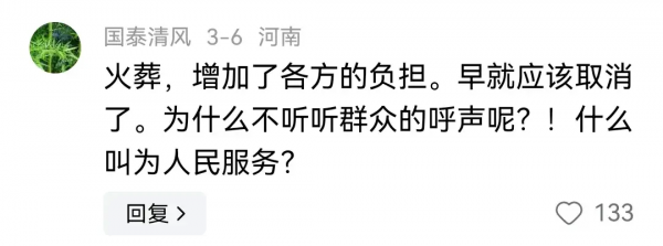 有网友评论∶关键是火葬场费用高啊,我们小县城都最低费用都要5-6万,10万以上,费用包括送葬人吃和安葬地最低5到6万以上。