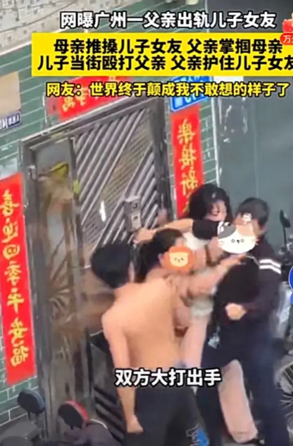 在广州,男子发现了父亲和自己的女朋友又有不正当关系,随后叫着母亲一起抓奸,当场堵住。母亲打女友,父亲阻止还打了母亲,儿子也开始殴打父亲。民警来了才得到控制。