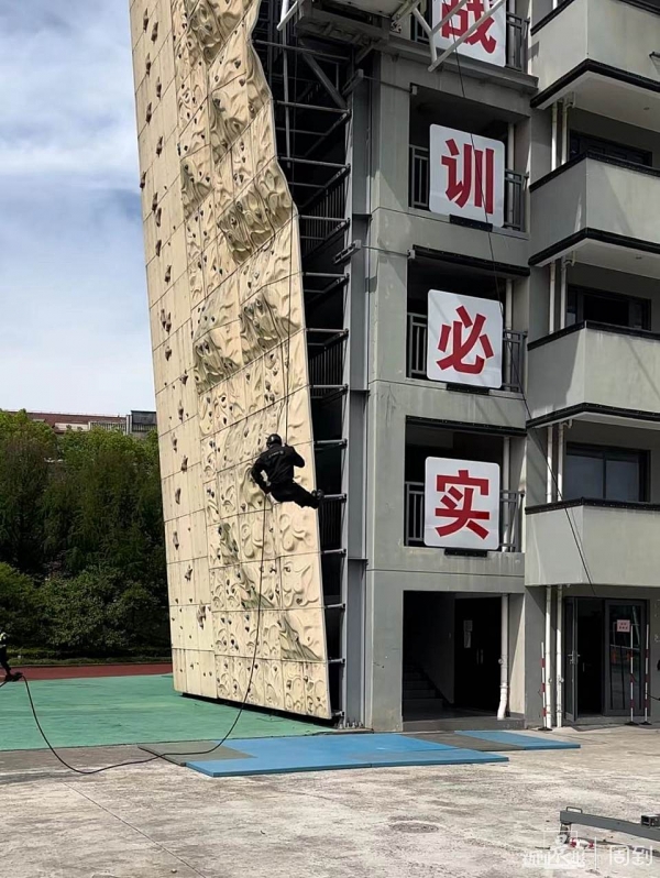 "这个项目是在模拟直升机上特警速降的过程。"该项目的负责人金警官介绍道,特警队员们在5层楼高度的平台上,利用绳索进行速降。