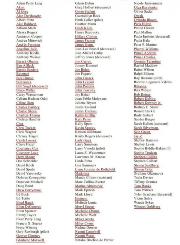 随着视频曝光后,一份多达187人登上"萝莉岛"的名单也被曝光!其中政圈、商圈、娱乐圈无一幸免,美国前总统克林顿、拜登父子、奥巴马夫妇、霍金、比尔·盖茨等多位大佬都在名单中。