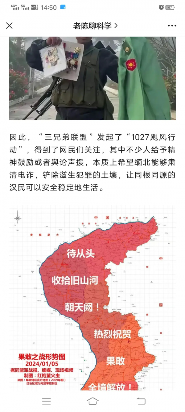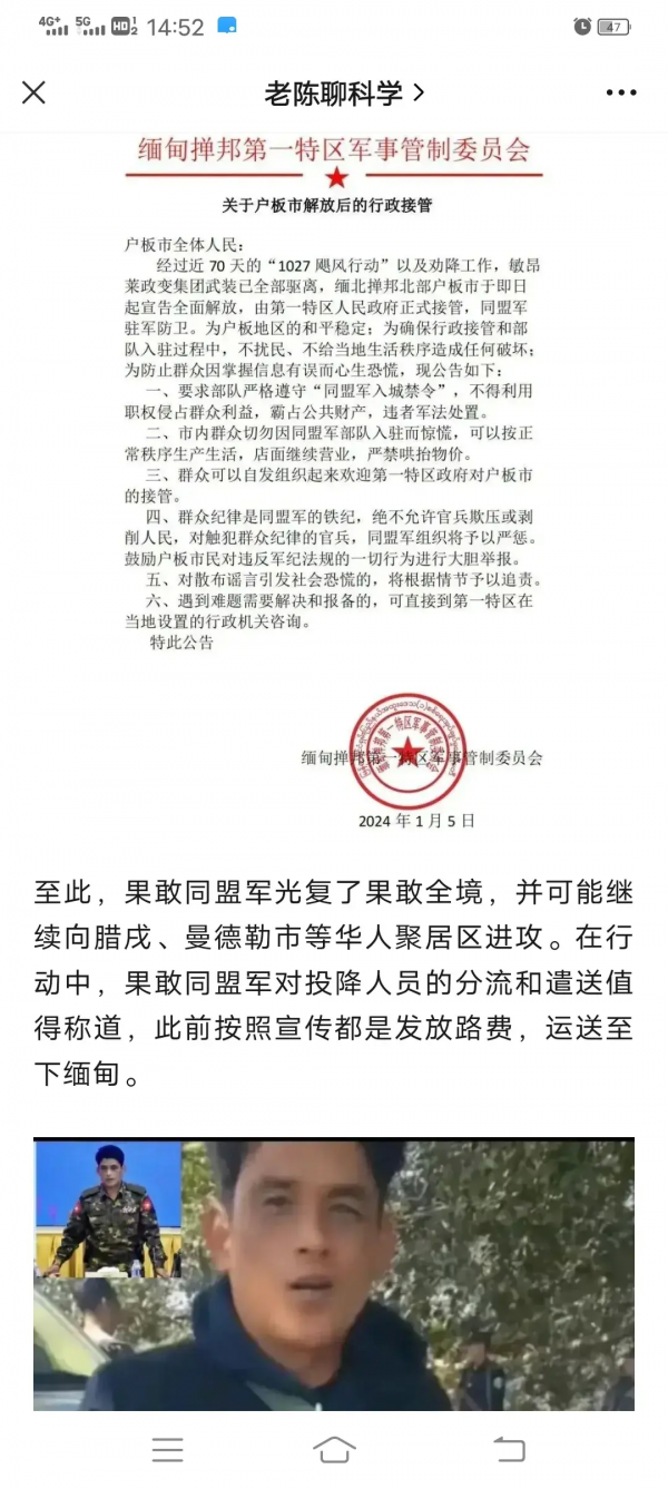 2024年1月5日,经过两个多月的坚苦奋斗,果敢同盟军及其少数民族"三兄弟联盟",终于攻克老街首府,完全光复果敢!最后取得了决定性胜利!