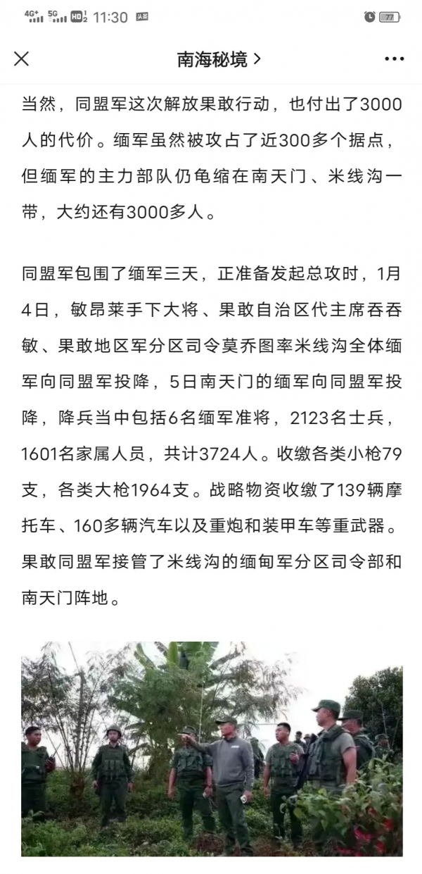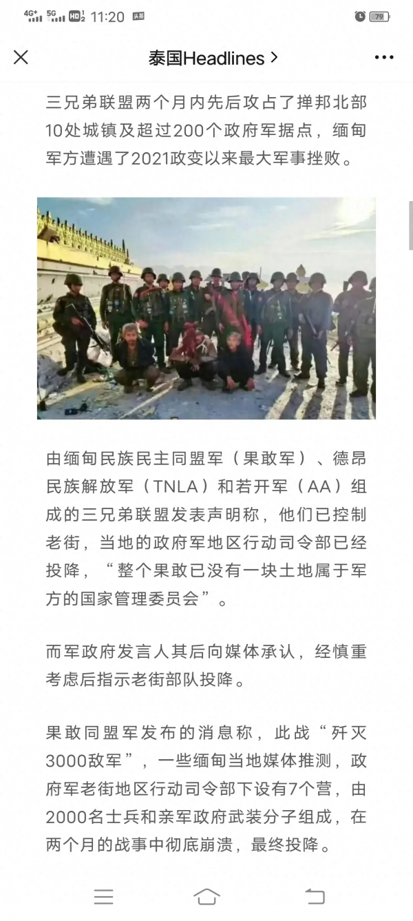 自上年1027飓风行动以来,同盟军联合三兄弟(民主果敢同盟军+德昂民族解放军+若开军三兄弟联盟)披荆斩棘,攻城拔寨,不畏艰辛,以弱胜强,两个月来先后攻占缅北十多处城镇,200多个军据点,袭击敌军五、六千,逐步瓦解,步步为营,使缅甸军方自2021年政变以来遭遇最大的惨败,严重动摇颠覆了其军心。