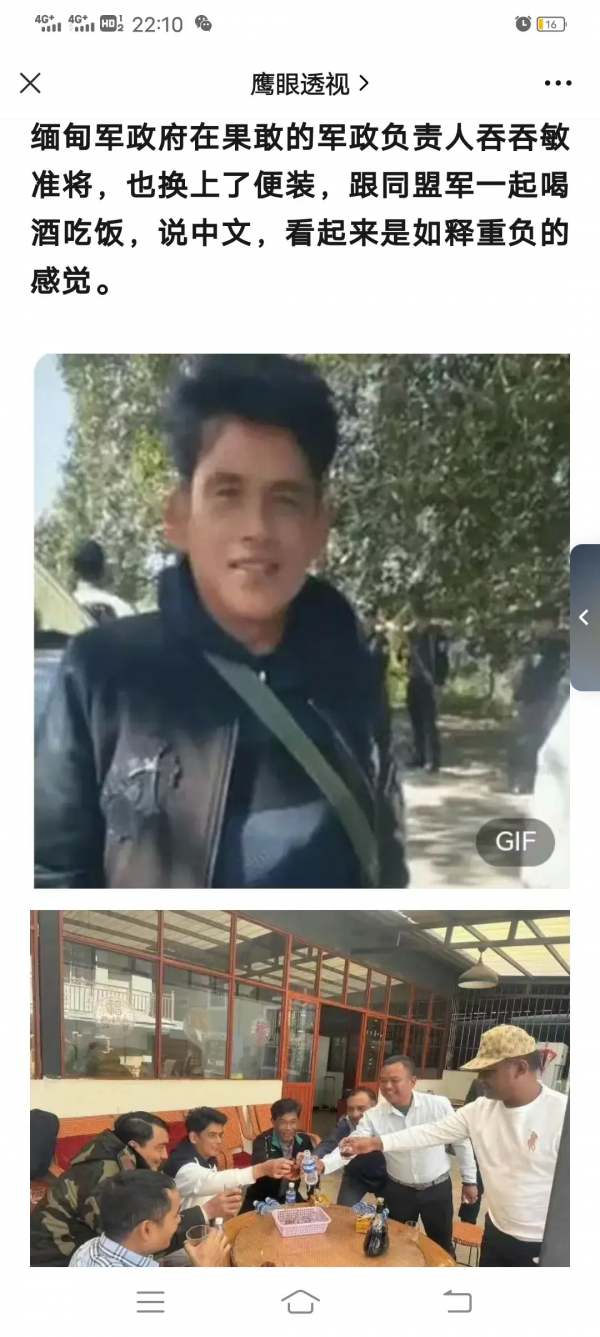 决心投城,如获释重,解除压力,举杯同庆!脱下军装,双方交杯换盏,把酒言欢。不信您看,缅军准将敏吞吞,举起酒杯,开怀豪饮,多日彻夜熬战的熊猫眼也如获释重、逐笑颜开!