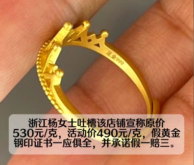 近日,浙江杨女士网购了一枚金戒指,收货后用火一烧变白色了,杨女士录视频吐槽该店铺宣称原价530元/克,活动价490元/克,假黄金钢印证书一应俱全,并承诺假一赔三。
