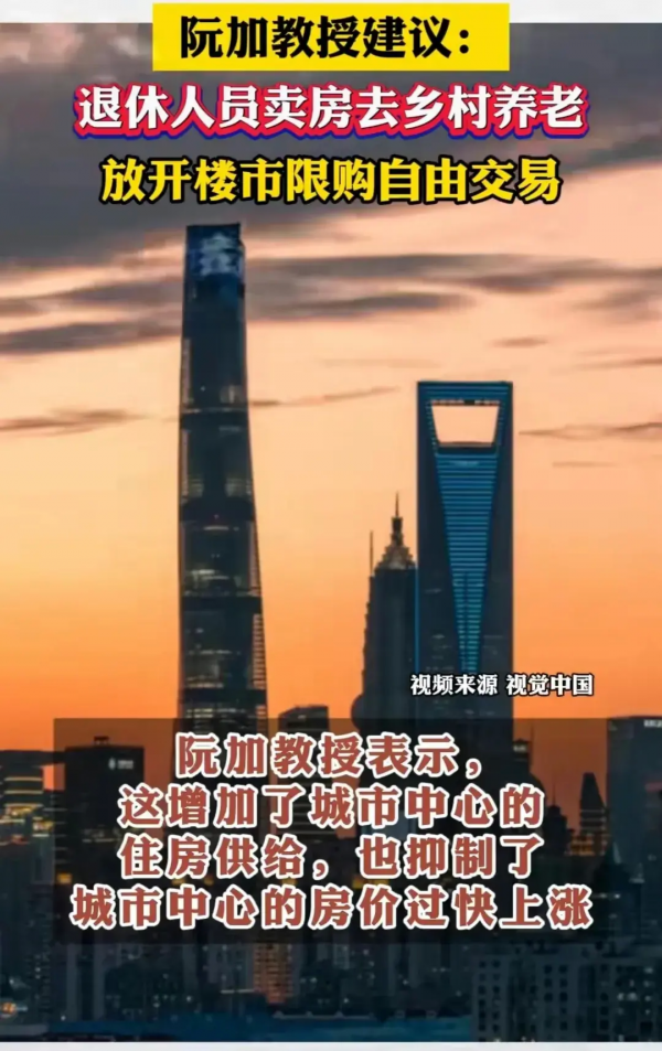 近日在2023"年度财经思想者"盛典上,备受瞩目的北京交通大学教授阮加向大众提出了一个醍醐灌顶的建议:退休人员应该卖掉城市里的住房,前往宁静的乡村养老。这个引发全国关注的提议实际上是为了增加城市中心的住房供给,抑制房价过快上涨。