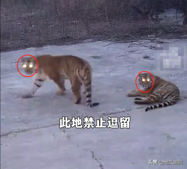 我们可以看到老虎躺在水泥地上面十分惬意,没一会,监控中就走进了一个体型较小的东北虎,两只老虎在嬉戏打闹,倒真是自在极了,可是这时候,监控却突然亮起了灯光,识别出了有人正在附近活动,直接响起了语音:"请勿在此逗留"