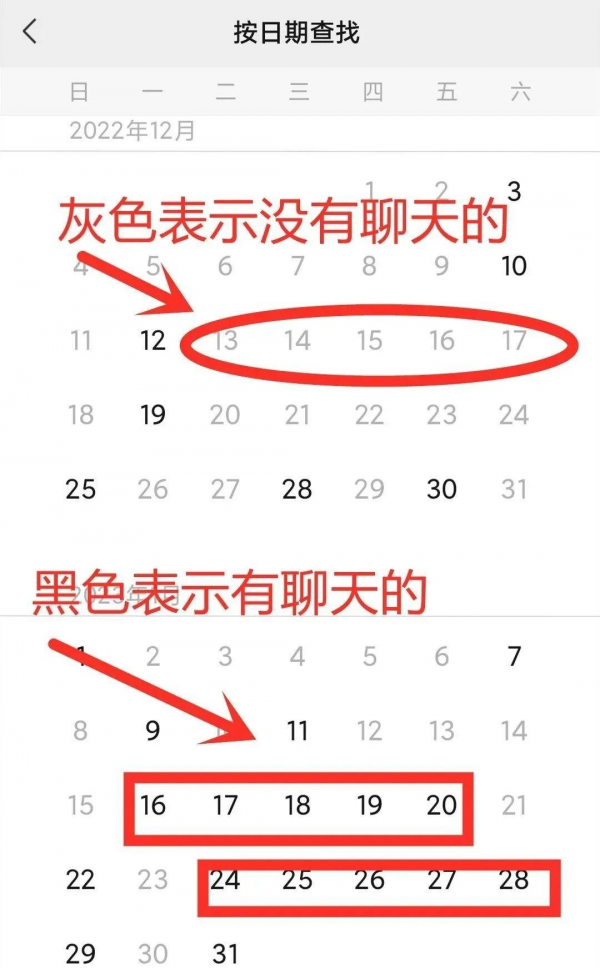 以"日期"为例,我们点击该选项后会显示当前的时间日期,然后选择要查询的日期。在日期中会有两种颜色,一种是黑色,一种是灰色。黑色代表经常聊天的日期,灰色则表示没有聊天的日期。
