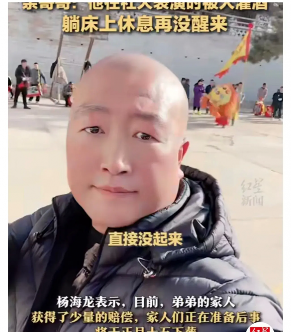 据杨海龙回忆,事发当天他们受邀参加社火表演,作为表演队员的他和弟弟杨老二都参与了其中。然而,在表演过程中,有人不断向杨老二灌酒,尽管他试图劝阻,但最终还是没能阻止。表演结束后,杨老二躺在床上休息,杨海龙则继续参加第三场表演。然而,当晚7时许,杨海龙发现弟弟已经无法叫醒,医护人员赶到现场进行抢救,但最终未能挽回杨老二的生命。