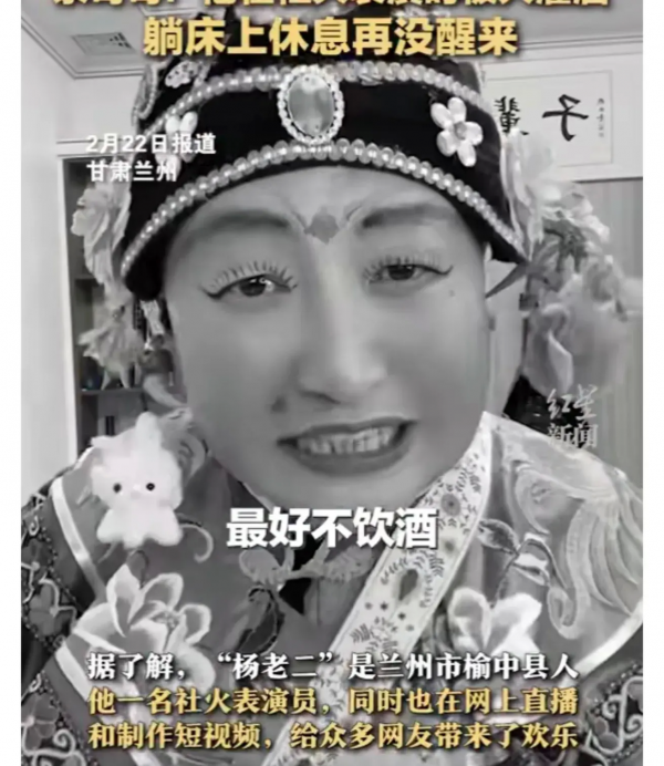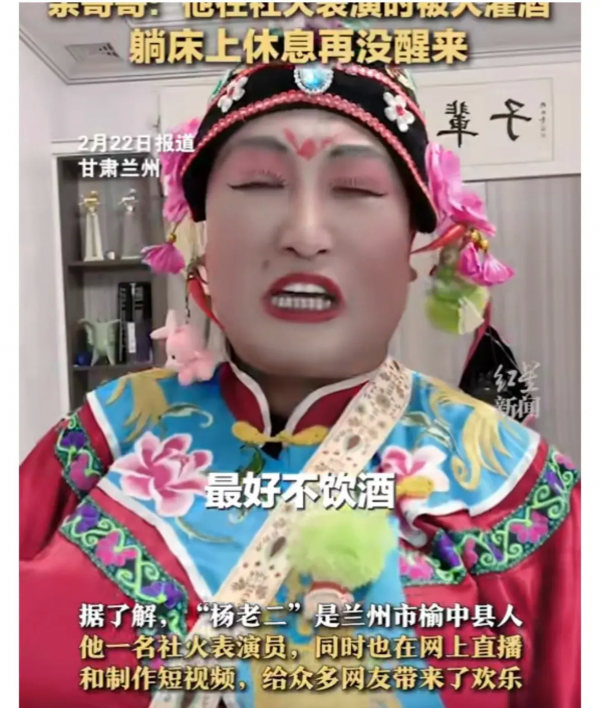 近日,甘肃网红"杨老二"突然离世的消息震惊了网络。据其哥哥杨海龙透露,杨老二在参加社火表演时疑似被人大量灌酒,之后躺在床上休息却再也没有醒来。这一事件引发了网友对社火表演文化以及网络红人背后生活的关注和思考。