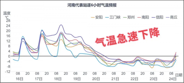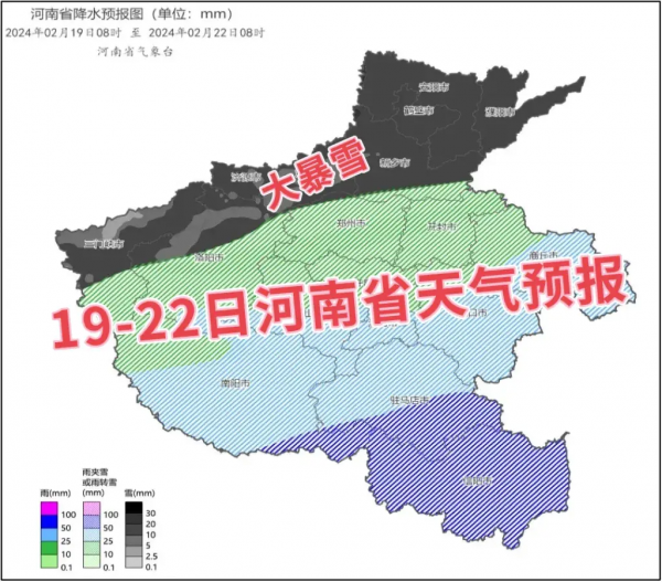 根据河南气象台发布的最新气象预报信息,19日-21日河南省将迎来大范围强寒潮和明显雨雪天气。气温降幅剧烈,最高气温下降18~22℃,最低气温下降10~15℃;全省大部将先后出现雨、冻雨、雨夹雪、雪等复杂降水天气,豫西、豫北有暴雪、局部大暴雪。