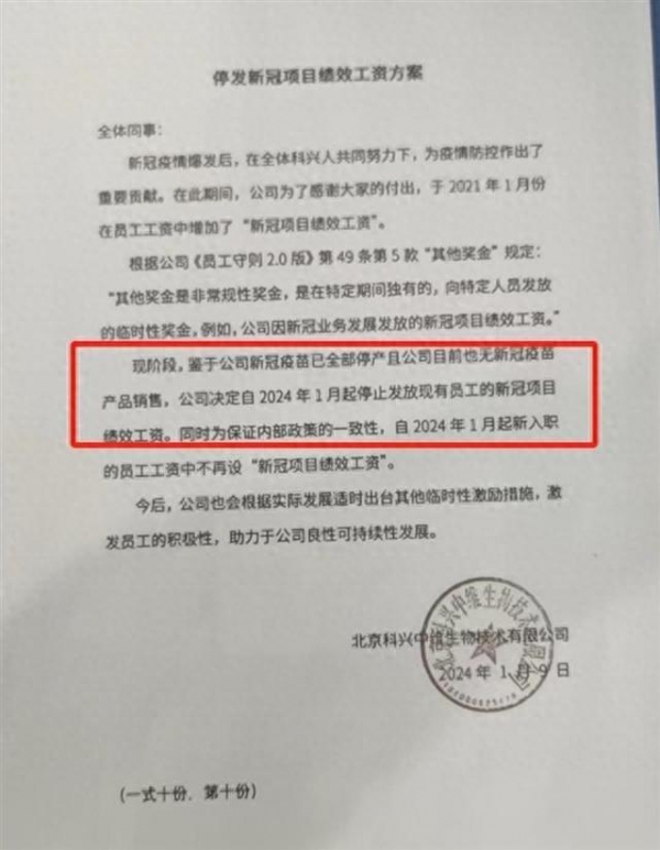 其中部分原文如下:现阶段,鉴于公司新冠疫苗已全部停产且公司目前也无新冠役苗产品销售,公司决定自2024年1月起停止发放现有员工的新冠项目情效工资。同时为保证内部政策的一致性,自 2024 年1月起新入职的员工工资中不再设"新冠项目绩效工资"。