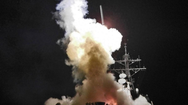 美军驱逐舰发射战斧导弹