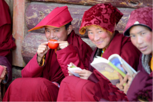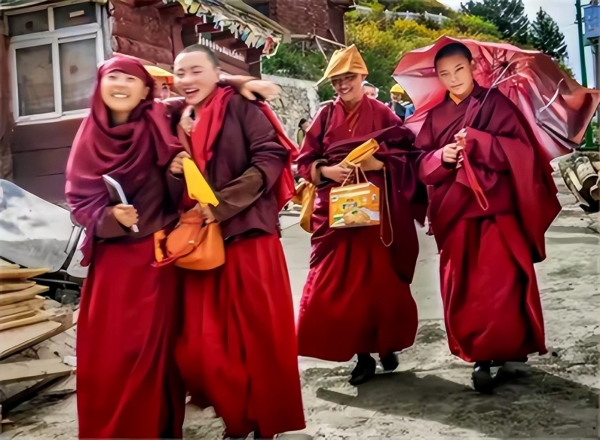 原来在藏族佛教中,人们认为黑色是不纯洁的,代表着邪恶,与佛教这种圣洁清净之地相悖,所以觉姆们不能穿黑色的尼裙。