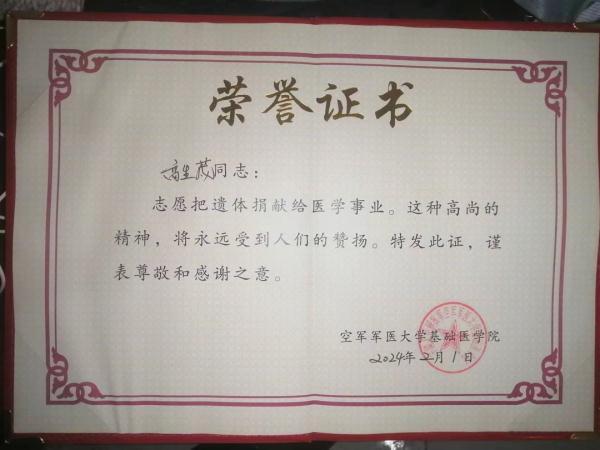 空军军医大学基础医学院颁发的荣誉证书上写着,志愿把遗体捐献给医学事业,这种高尚的精神,将永远受到人们的赞扬。
