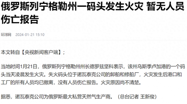 据"央视新闻客户端"报道,当地时间1月21日,俄罗斯列宁格勒州州长德罗兹坚科宣称,当天凌晨,该州乌斯季卢加港的一处码头发生火灾,目前所有人员均已撤离,没有人员伤亡报告,失火的码头隶属诺瓦泰克公司,后者是俄罗斯最大的私营天然气生产商。