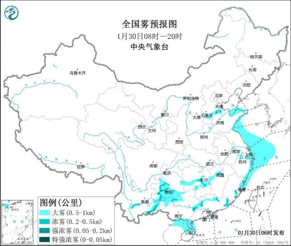 预计,在1月30日白天,黄海西部海域、东海西部海域、北部湾北部海域、琼州海峡、莱州湾、山东半岛沿岸海域、江苏沿岸海域、长江口及杭州湾附近海域、浙江沿岸海域、福建北部沿岸海域、广东西部沿岸海域将有能见度不足1公里的大雾。