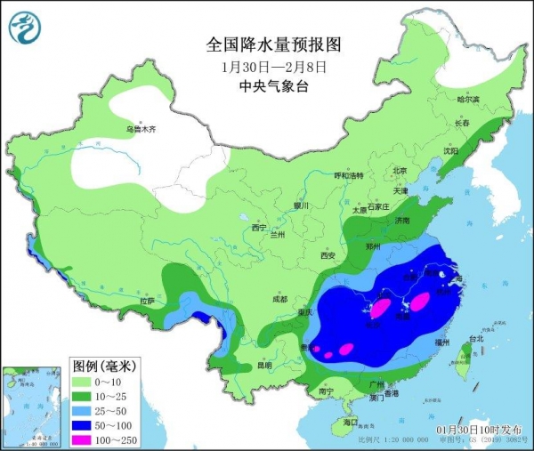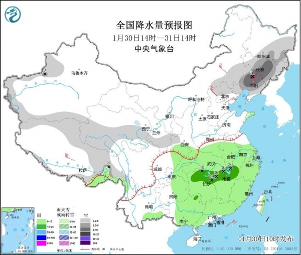 随着寒潮持续降临,中东部有大范围持续性强雨雪天气。江南、黄淮、江汉、江淮、华南中北部等地累计降水量有10~40毫米。华北、东北地区东南部等地累计降水量有3~10毫米;上述地区降水量较常年同期显著偏多。