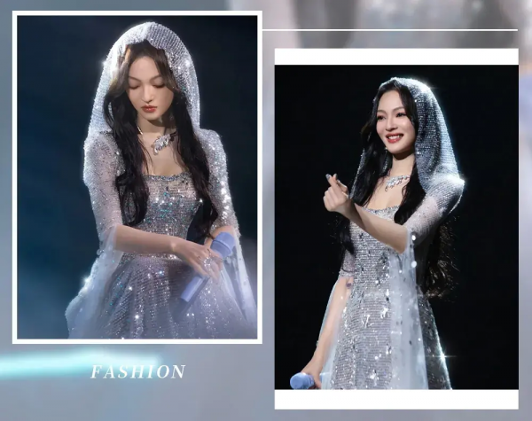 斗篷礼服妥妥的神女既视感!灯光洒在身上,泛起点点星光,宛如璀璨银河,把整个舞台都点亮了。