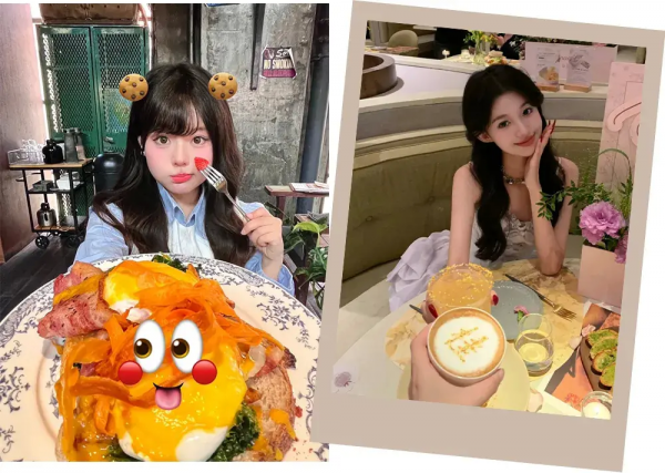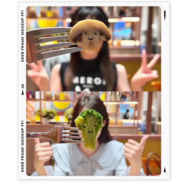 不想露脸就用食物遮住五官,再p上一点可爱的小表情,有创意极了~