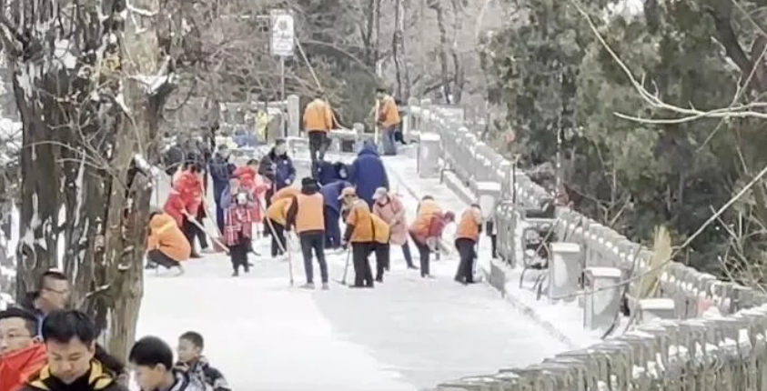 2月14日夜至15日凌晨,泰山突降大暴雪(降水量13.8毫米),目前泰山盘道、旅游公路、山顶观景平台等出现较大面积的积雪积冰现象。冻雨形成的道路积冰--地皮甲清理难度较大,景区正全力清除积雪积冰。经过泰山景区3000余名干部职工和当地500多名公安、消防、特警以及驻山经营户一整天的努力,景区积雪基本清理完毕。