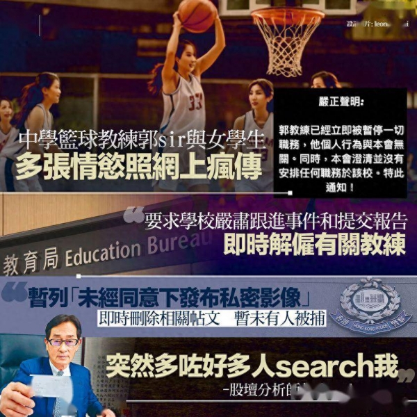 昨日(22日)网上多个群组流传港岛南区一间中学的一名男篮球教练与一名女学生的不雅照片,有关帖文现已删除。警方今日(23日)表示,案件暂列作"未经同意下发布私密影像"跟进调查,暂未有人被捕。