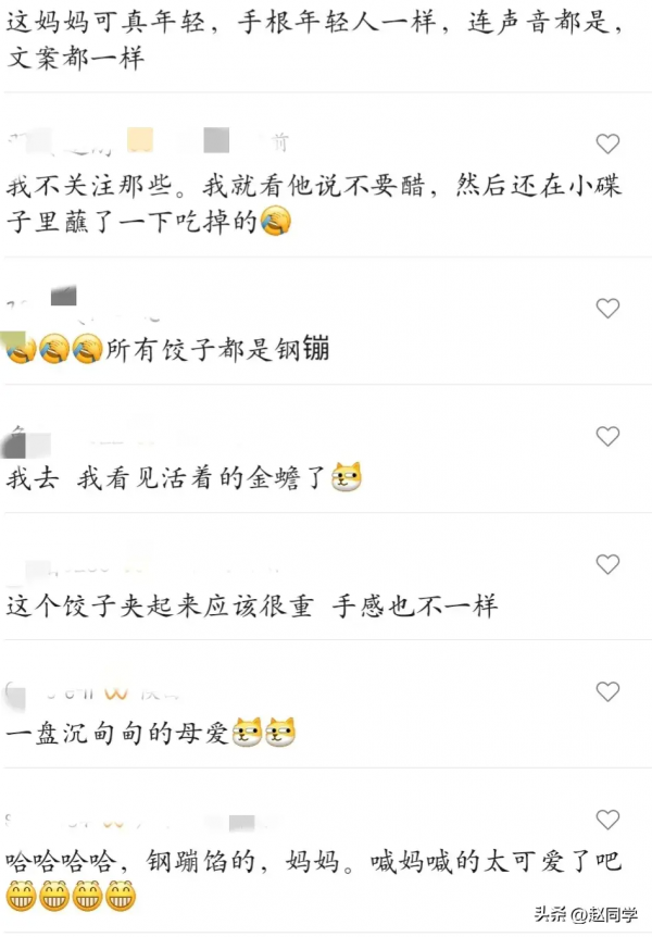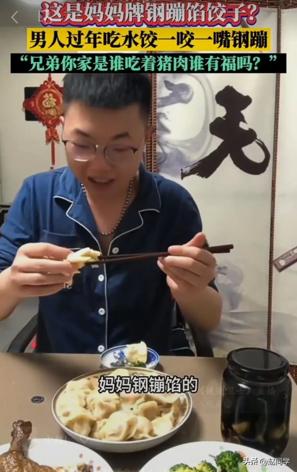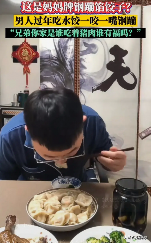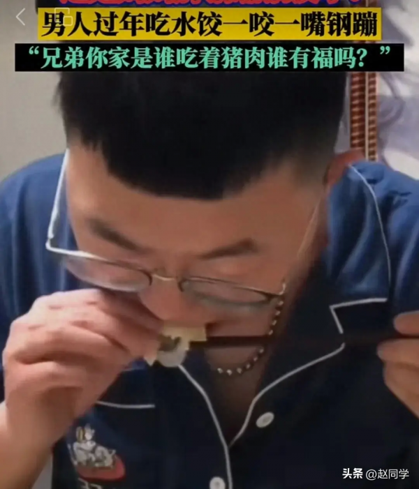然而,当男子妈妈把饺子端上桌时,男子发现饺子的馅料有些与众不同。一口下去,饺子里面夹杂着一些小小的钢蹦,男子懵了,问妈妈:"这是钢镚馅的饺子吗"?
