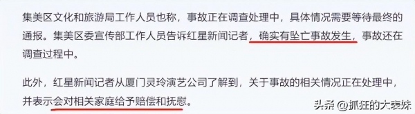 事发后,厦门市集美区应急管理局证实了此次事件的发生,并确定有1人死亡,最终原因正在调查中,而去世女孩的演艺公司则回应将会对这3名伤亡女演员进行相关补偿。