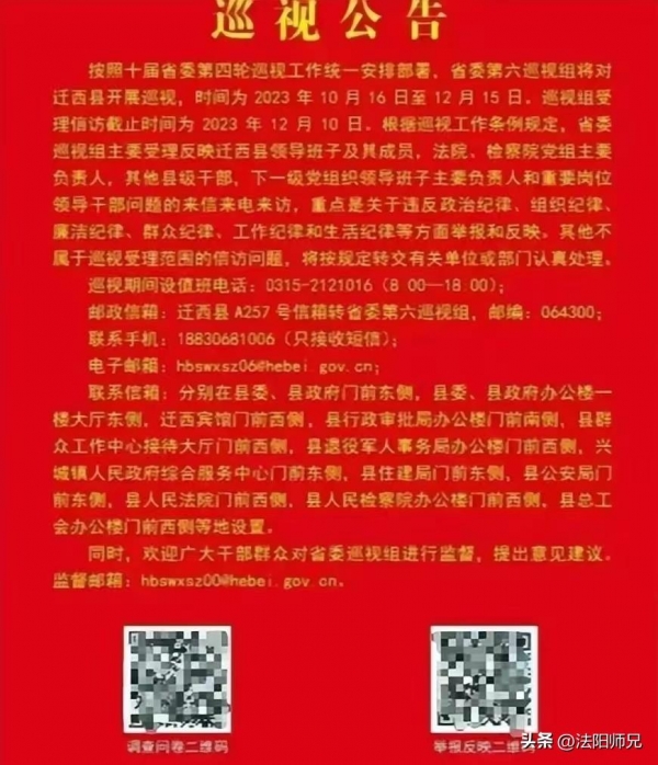 从老人举报从8月份开始,到被抓前后经历近4个月时间,省委第六巡视组曾于2023年10月16日到12月15日对迁西县进行了巡视,巡视组是否收到老人的举报,是否介入调查取证,现暂不明确。