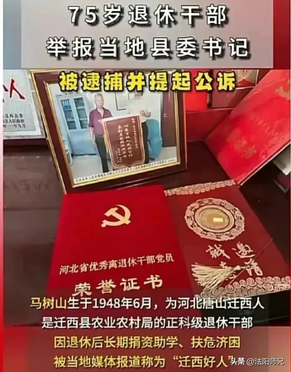 2024年1月15日下午5时许,75岁的马树山因举报唐山市迁西县县委书记李贵富被逮捕,现已获得取保候审,期限为6个月,现在社区工作人员的陪同下,已回到家中,暂获自由。