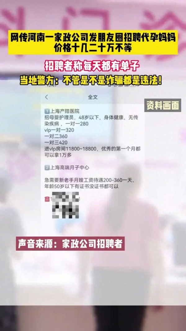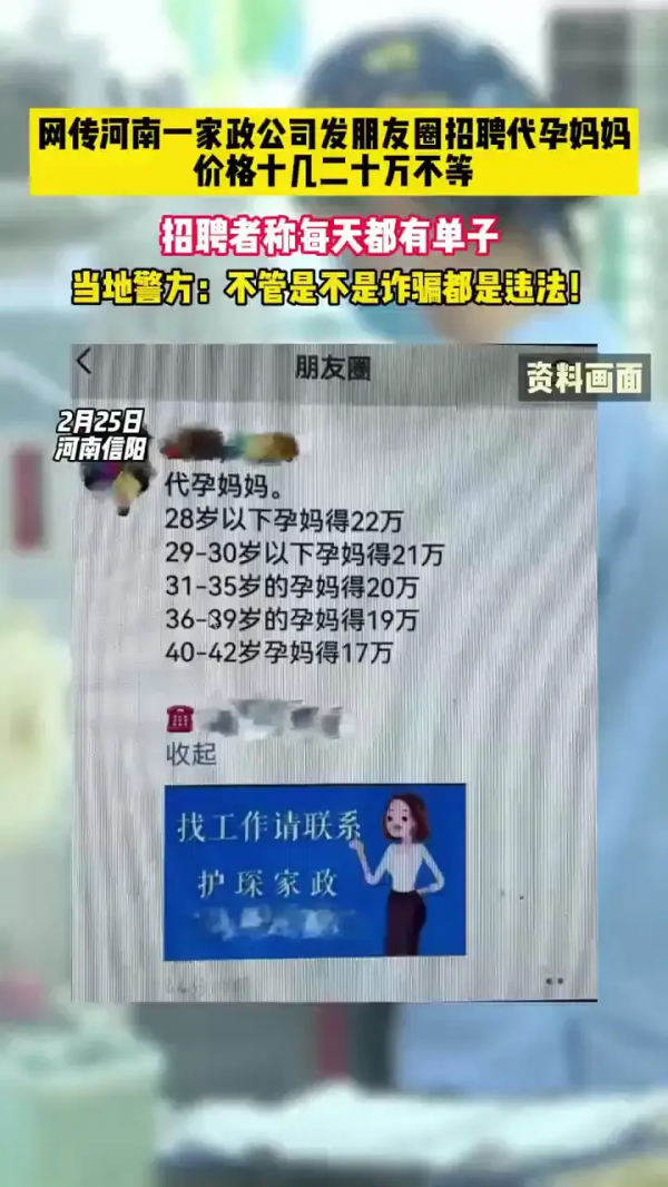 在如今这个信息爆炸的时代,朋友圈的各种信息琳琅满目,有时候不禁让人眼花缭乱。然而,近日在河南信阳,一则家政公司发朋友圈招聘代孕妈妈的消息引起了公众的关注。据报道,这家家政公司发布的招聘信息中,代孕妈妈的价格从十几万到二十万不等。这一行为不仅引发了社会伦理的争议,更触碰了法律的底线。
