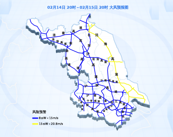 2月14日20时至2月15日20时,受冷空气影响江苏全省风力增大,陆上偏北风5级阵风6到7级。受大风影响的高速主要有:沈海高速、连霍高速、淮徐高速、新扬高速、京沪高速、长深高速、盐洛高速、宁靖盐高速、沪陕高速、沪蓉高速、宁宣高速、宁常镇溧高速、沪宜高速、沿江高速、苏嘉杭高速等。