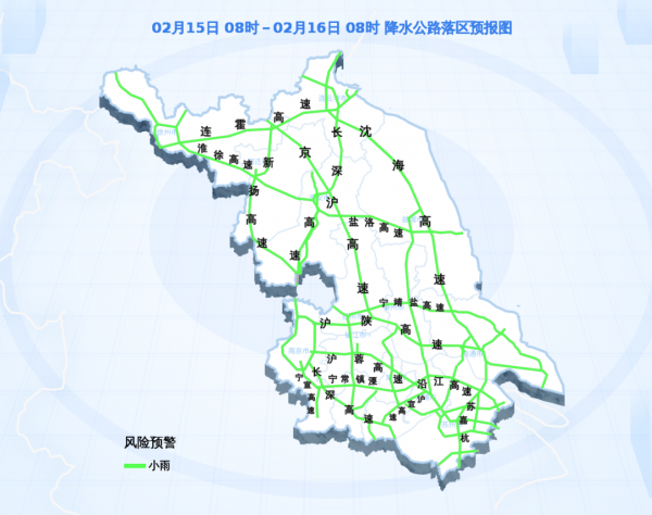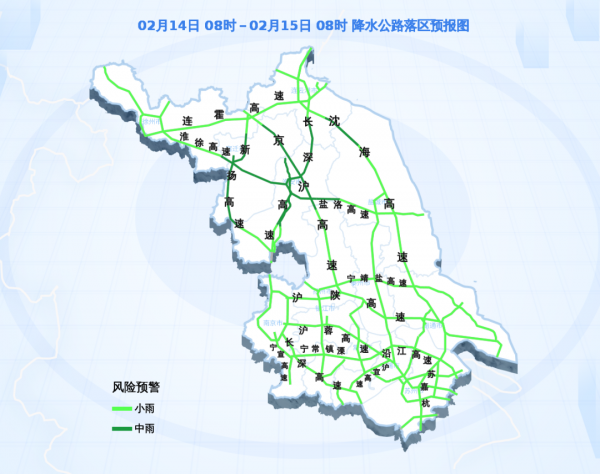 2月14日8时至2月15日8时,全省白天多云转阴,夜里阴有小到中雨。受中雨影响的高速主要有:新扬高速、京沪高速北段、长深高速北段、盐洛高速等;受小雨影响的高速主要有:连霍高速、宁靖盐高速、沪陕高速、沪蓉高速、宁宣高速、宁常镇溧高速、沪宜高速、沿江高速、苏嘉杭高速等。
