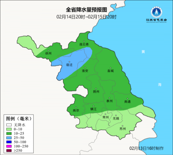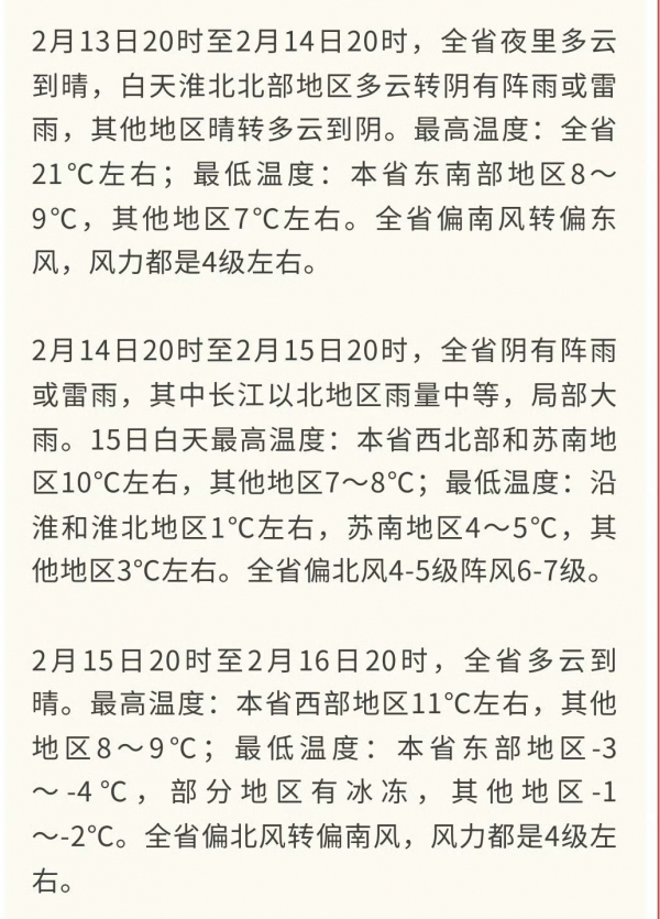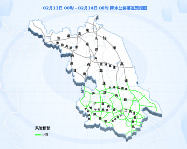 2月13日8时至2月14日8时,沿江和苏南地区多云转阴有时有小雨,其他地区多云到阴。受小雨影响的高速主要有:宁靖盐高速南段、沪陕高速、沪蓉高速、宁宣高速、宁常镇溧高速、长深高速、沪宜高速、沿江高速、苏嘉杭高速等。