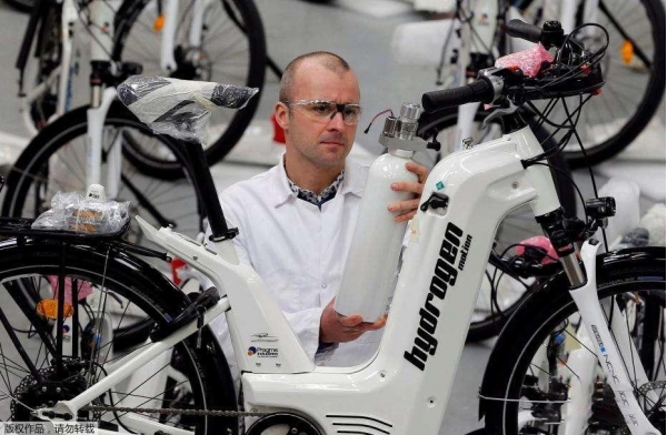 氢能源助力车的原理就是通过加氢气的方式,存在助力车上的储氢罐内,然后令氢气在两个电极之间发生分解生成质子,质子和氧气在阴极反应生成水,电子则被电极中间的介质所捕获,形成电流为发动机提供能源,让助力车行驶起来。