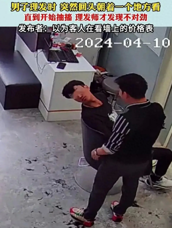 从相关视频中,我们可以看到黑衣男子坐在椅子上,当时理发师给男子洗吹剪的,男子突然回头朝着一个地方看,没一会儿男子开始抽搐,一开始理发师以为看男子看墙上的价格表的,结果他看到男子抽搐后,就很担心,赶紧拿出来手机打算拨打急救电话。